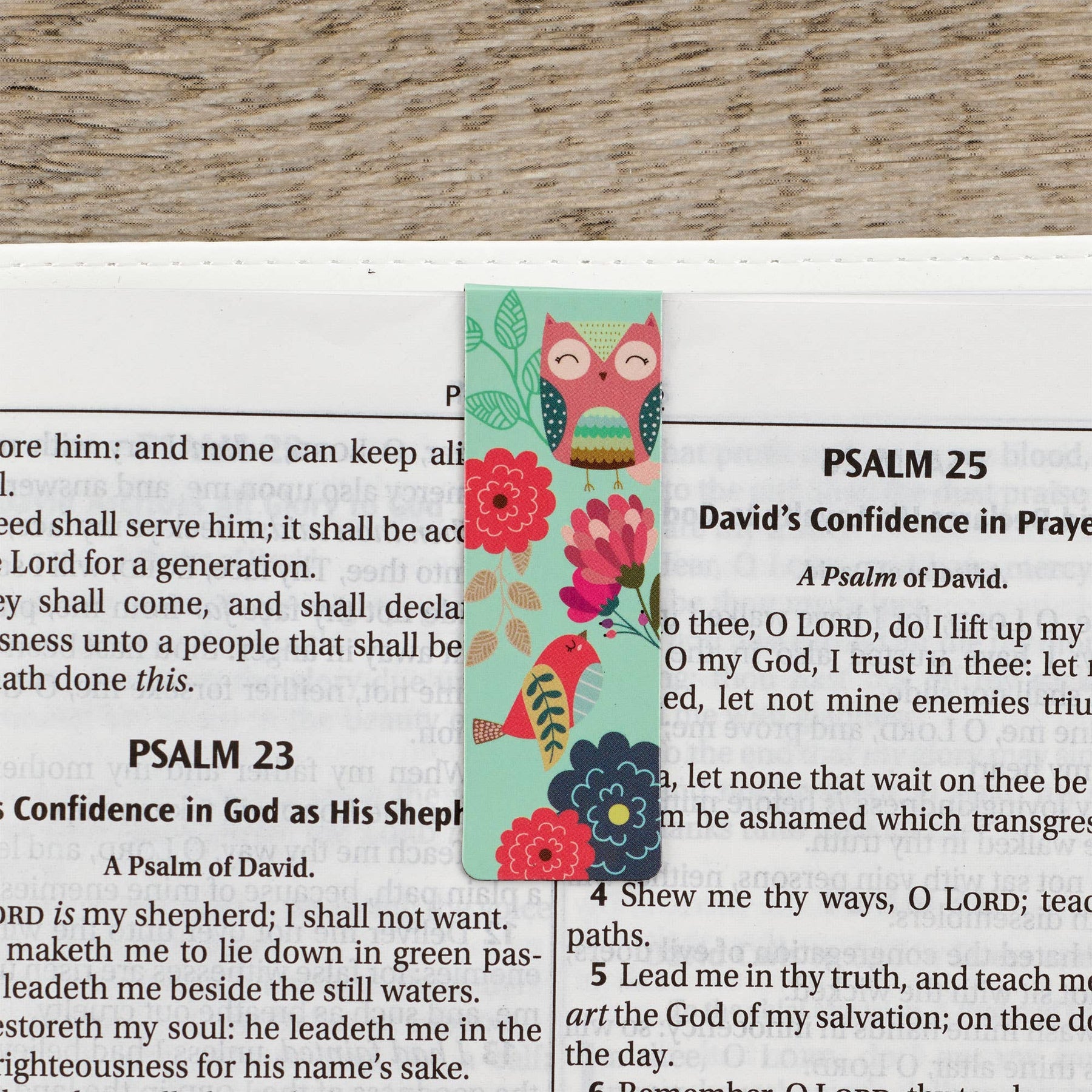 The playful set of 6 magnetic bookmarks is decorated with artistic drawings of different woodland creatures that include owls, birds, rabbits, and colorful flowers and leaves. The bookmarks have a fashionable color scheme of magenta, teal, and violet, which will add life to any book.