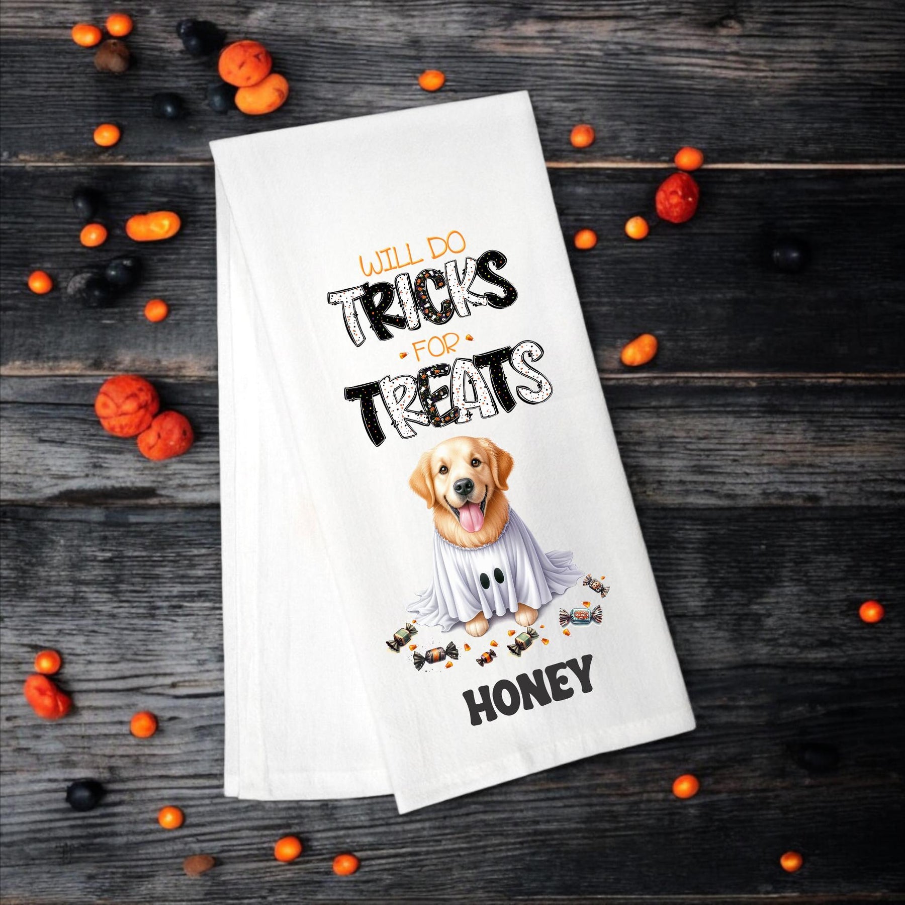 Brighten your kitchen with our "Will Do Tricks for Treats" Golden Retriever Tea Towel! Perfect for any Retriever mom, this charming flour sack towel features an adorable Golden Retriever ready to perform tricks for treats, making it a must-have kitchen towel for dog lovers. Ideal for drying dishes or adding a festive touch to your Halloween decor, this high-quality dish towel is both practical and delightful. It also makes an excellent dog lover gift, sure to bring joy to any Golden Retriever enthusiast. Celebrate your love for Retrievers and enhance your home with this unique dog Halloween decor!