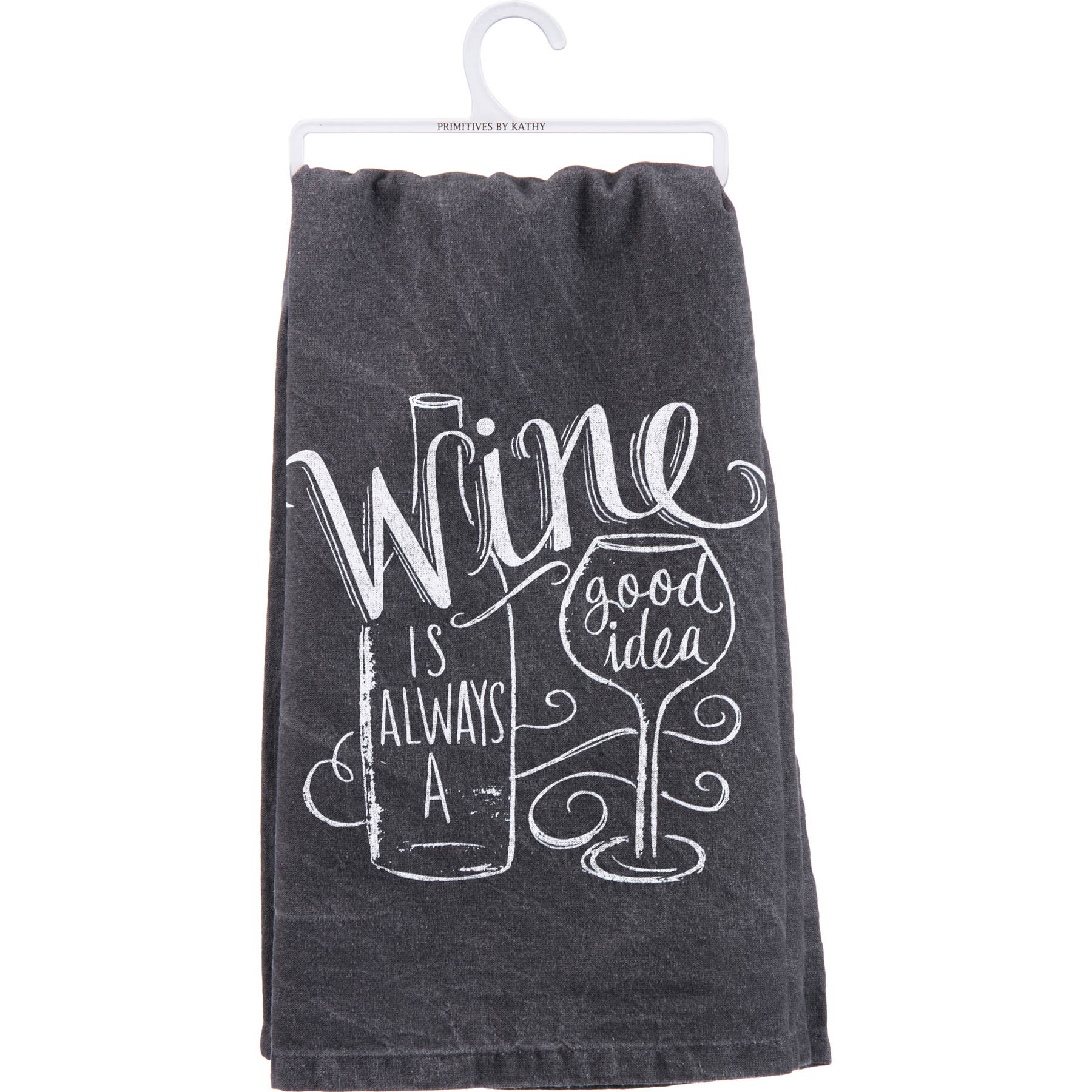 A black and white cotton kitchen towel featuring unique chalk art, hand lettered "Wine Is Always A Good Time" sentiment, and wine bottle and glass designs. Complements well with existing decor or coordinating design pieces. Machine-washable.