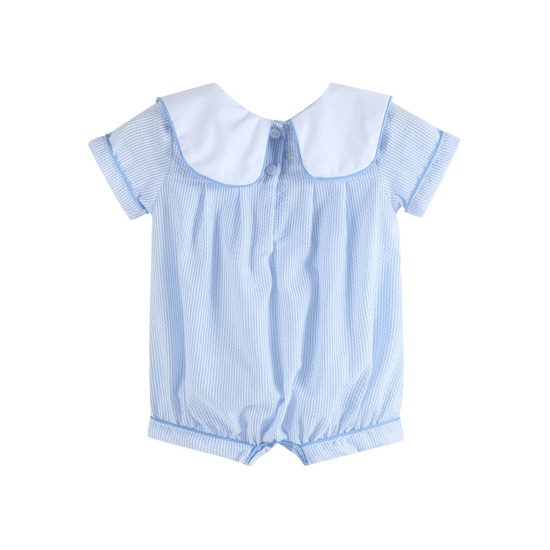 Get your little man hoppin' around in this adorable Blue Stripe Bunny Romper! With a playful bunny applique, this romper is perfect for springtime adventures. Comfortable and cute, your little one will love wearing this all day long.