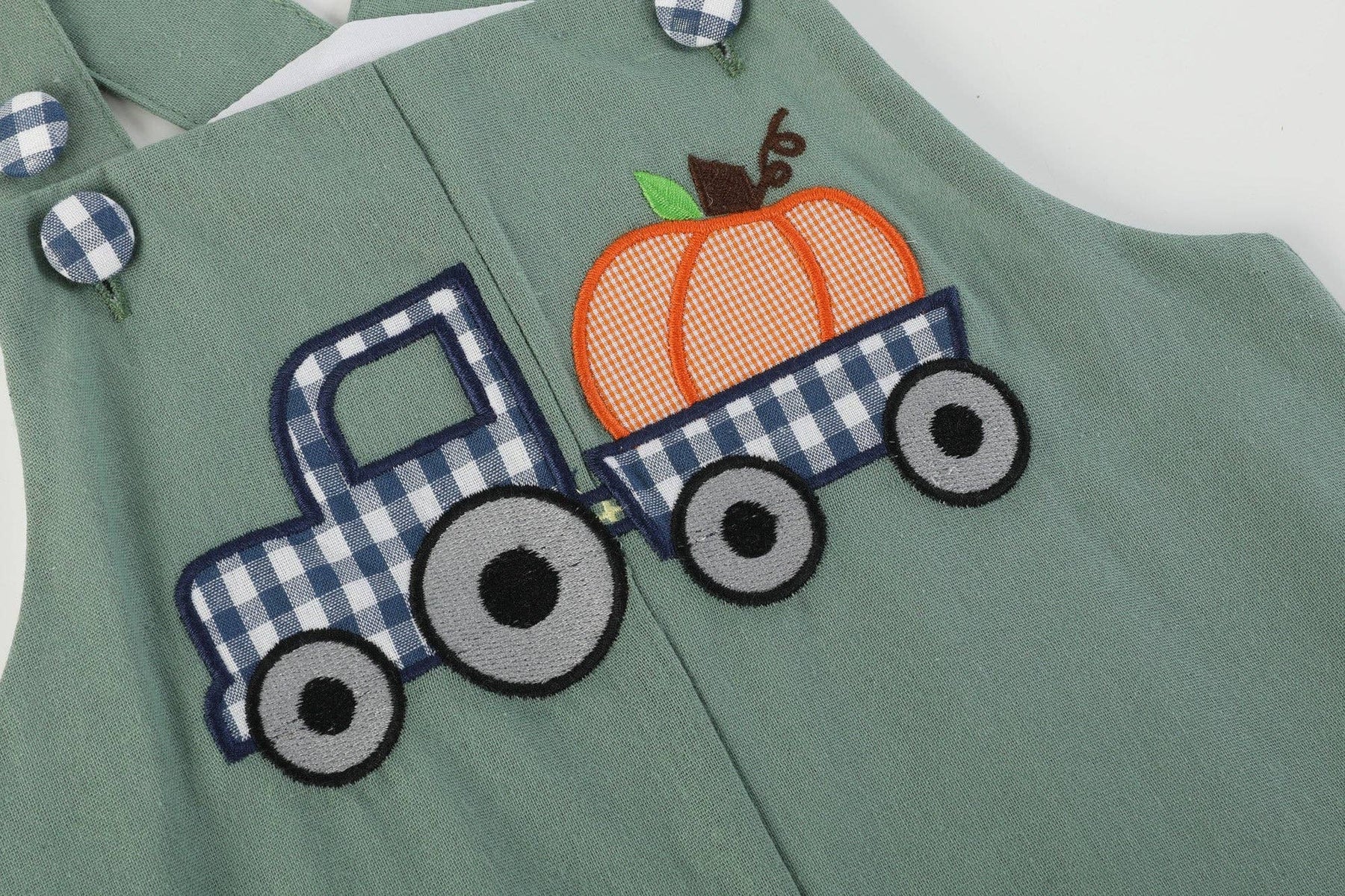 Embrace the fall vibes with our Green Pumpkin Tractor Overalls for your little adventurer! Adorned with charming appliqué tractor and pumpkin, these overalls capture the essence of autumn cuteness. Perfect for hayrides and pumpkin patches, dress your little one in seasonal style with this picture-perfect look your little pumpkin will love.