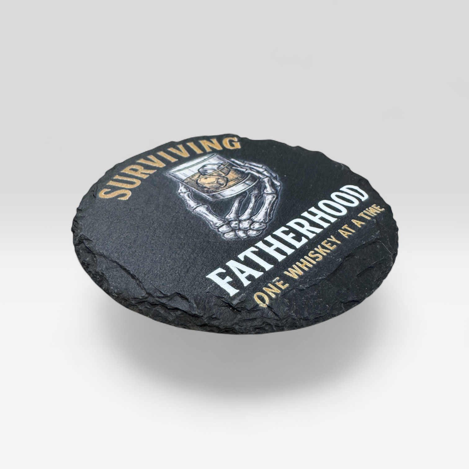 This playful slate coaster is the perfect gift for the dad who's mastered the art of surviving fatherhood—one drink at a time. Crafted from durable slate, it protects surfaces from moisture and stains while delivering a laugh-out-loud message every time he sets down his beverage. Whether it's for his home bar, office desk, or favorite relaxation spot, this witty accessory combines humor with practicality. A memorable present that celebrates his dad jokes, his resilience, and his well-deserved downtime.