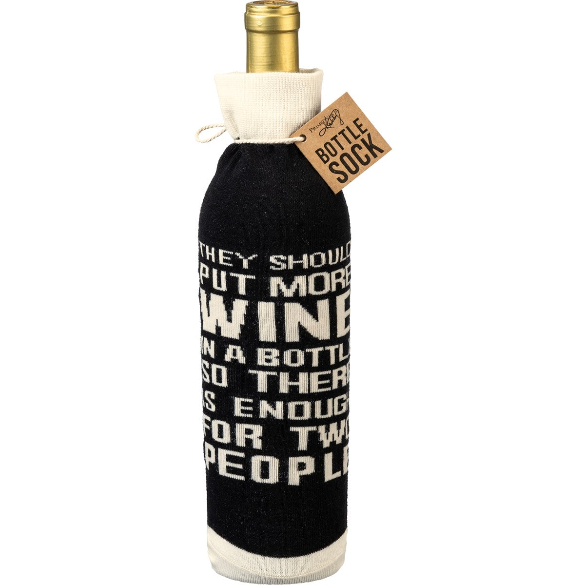 A creative alternative for a traditional gift bag, this washable and re-useable knit bottle sock features "They Should Put More Wine In A Bottle So There Is Enough For Two People" and "Warning: Don't Leave Wine Unattended It May Not Be There Upon Your Return" sentiments in box sign style design.