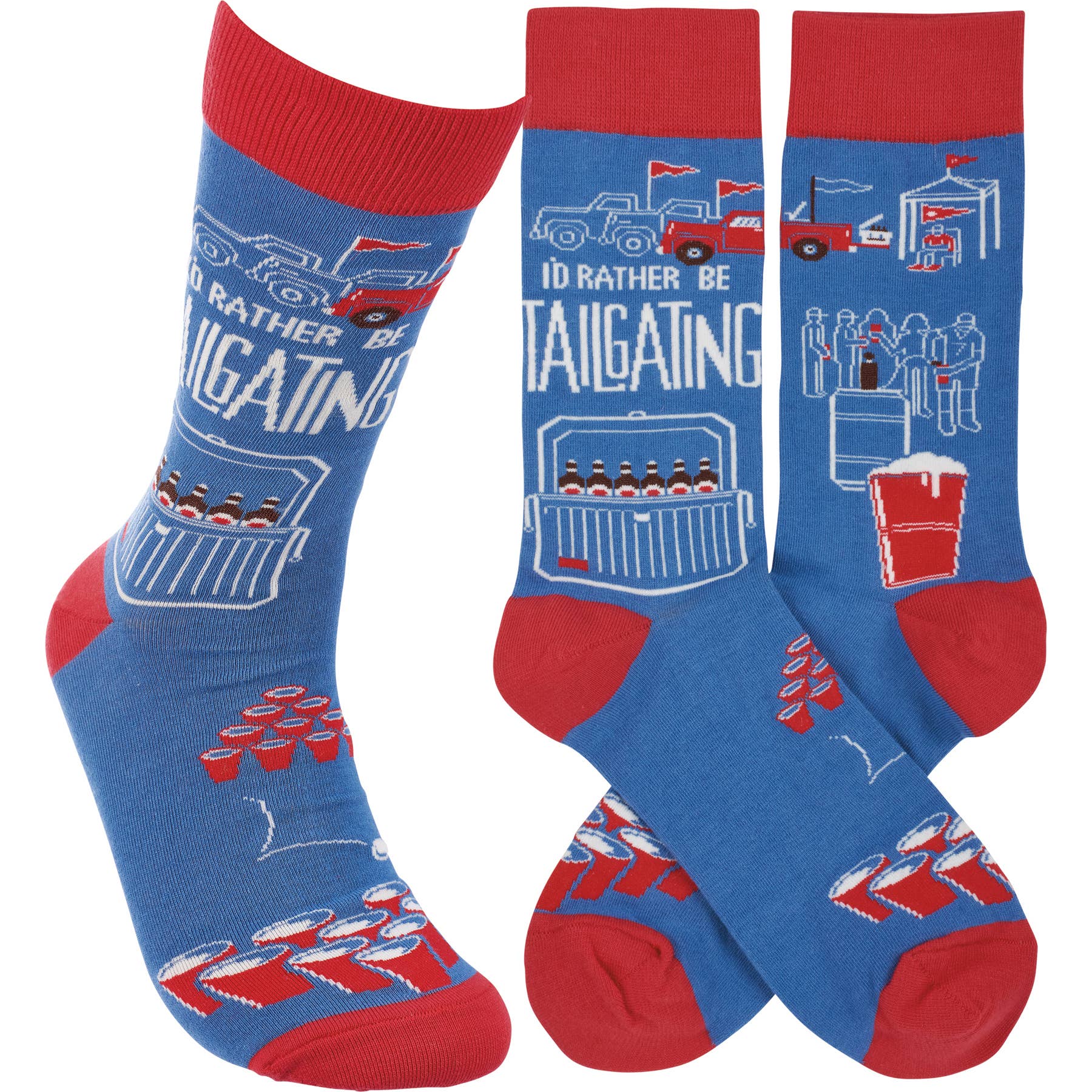 A pair of colorful woven socks from our Grilling & Chilling Collection displaying coordinating tailgating themed designs on each with humorous "I'd Rather Be Tailgating" sentiment.