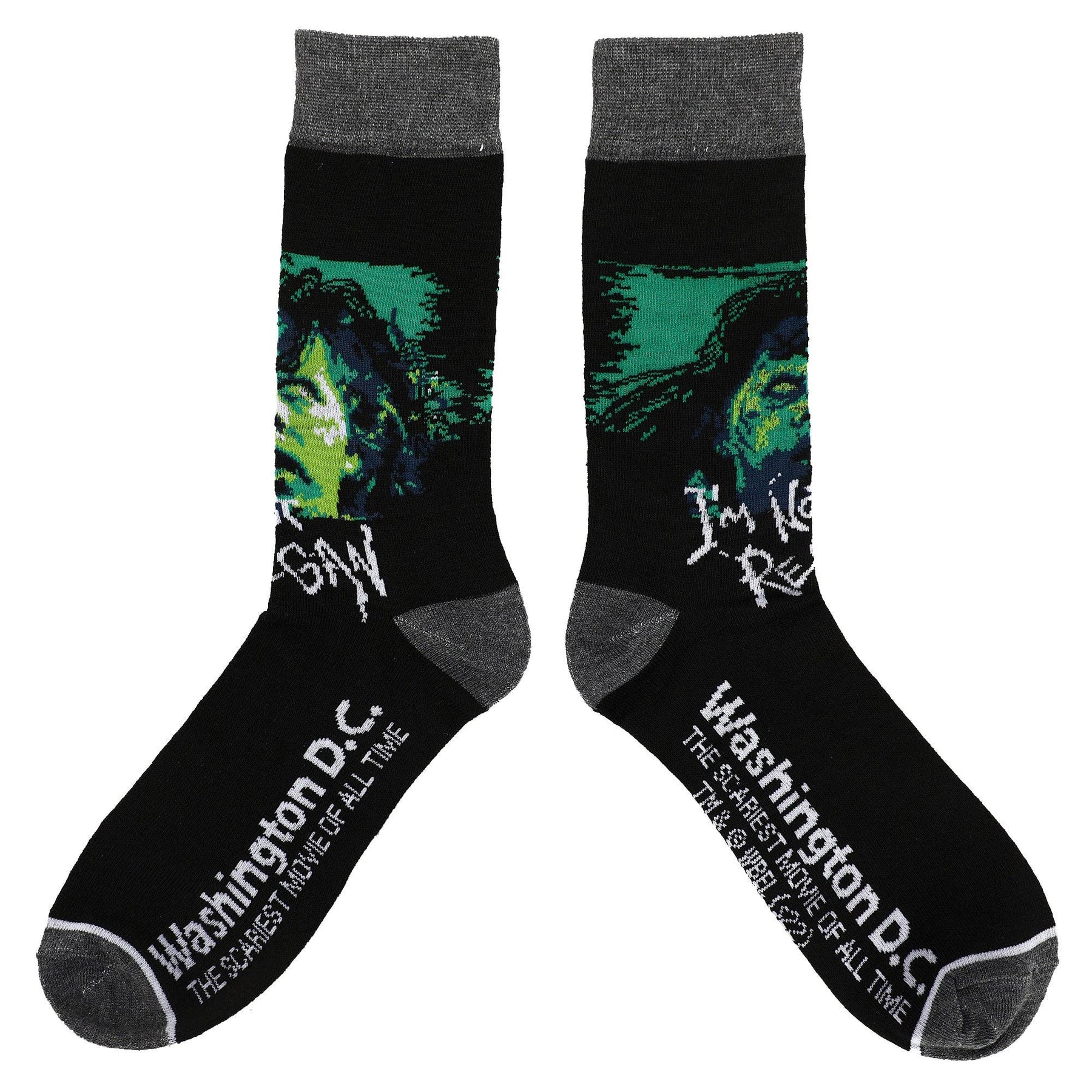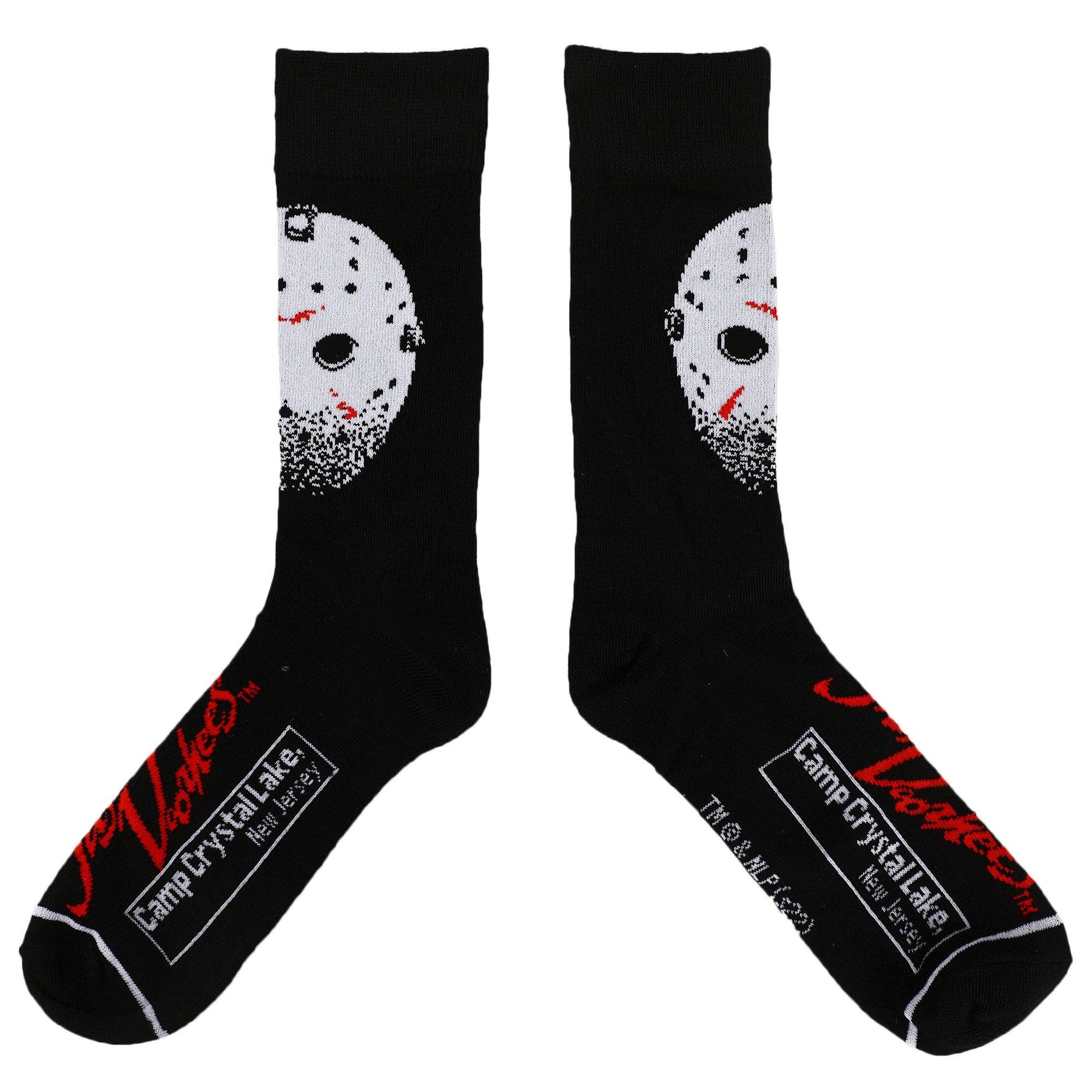Scare up some style with these Warner Brothers horror crew socks. The socks come in shades of red and black and feature images of Freddy Kreuger, Jason Voorhees, Pennywise, Regan, and the vampire fangs from The Lost Boy film while text at the bottom of the socks shows the setting for each horror film.