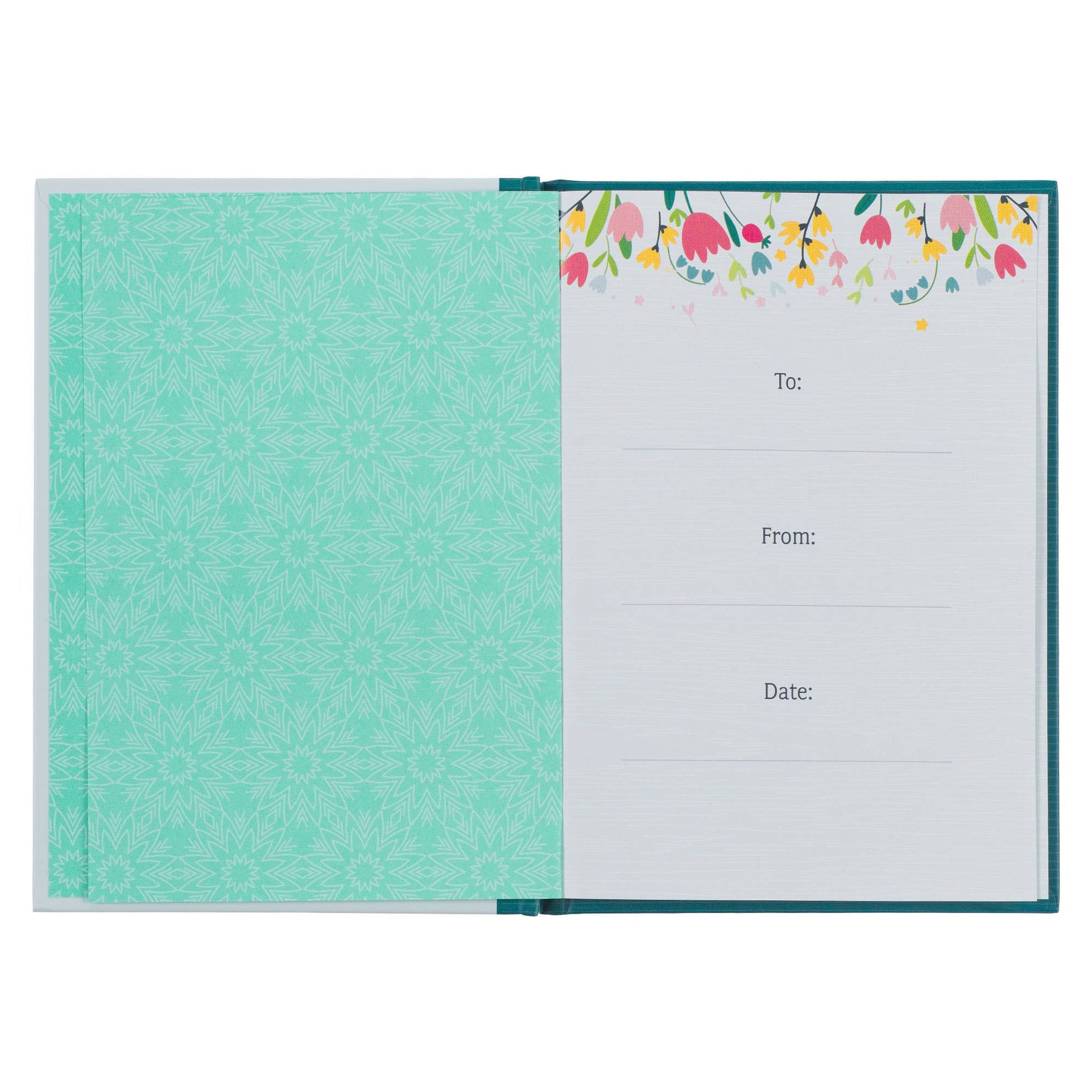 An open book growing bright flowers decorate the light teal front cover of the gift book and ground the title that is presented in multi-colored fonts.