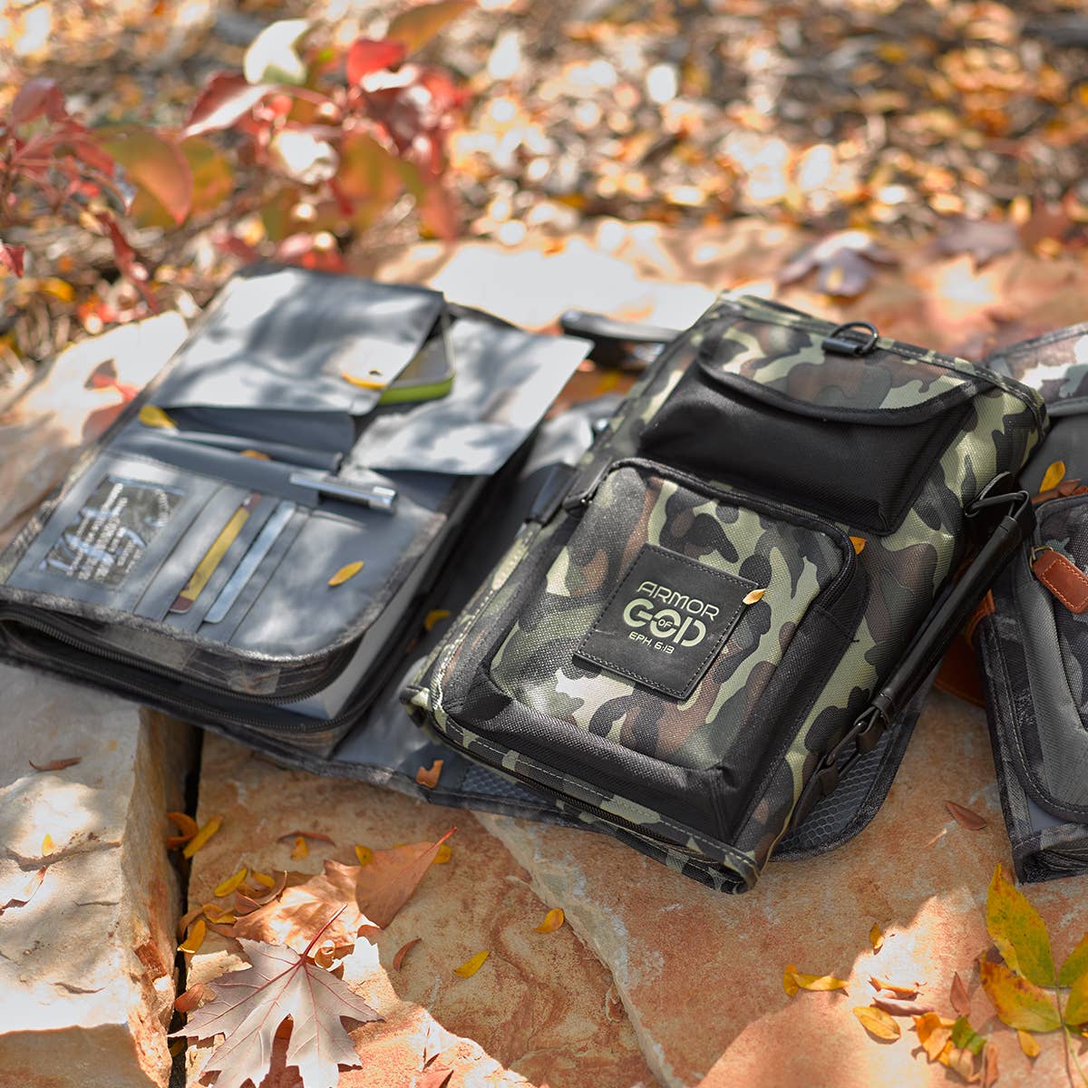 With the growing popularity of camo, our Tri-Fold Camouflage Bible / Book Organizer is sure to be a top choice! Perfect for class, Bible study group or the commute, this handy poly-canvas organizer provides well-thought-out storage features. On the front, you'll find a velcro tabbed pouch to accommodate your phone, and another with a faux leather tabbed zipper that is large enough for a wallet.